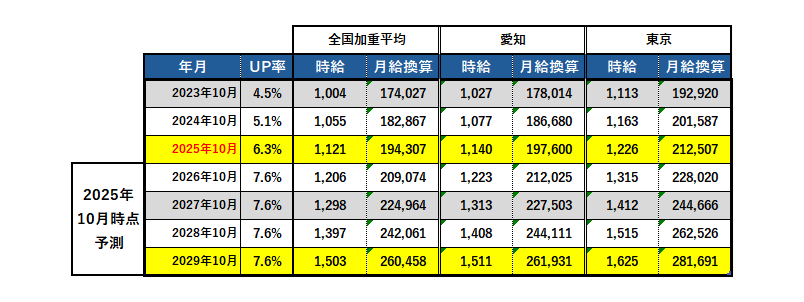 2025年10月時点の最低賃金政府目標とその後の予測